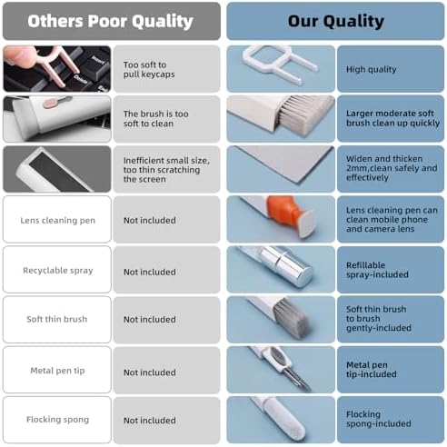 The multifunctional monitor cleaning kit can deep clean all your electronic devices. The retractable large moderate soft brush is ideal for cleaning the gaps between laptop and keyboard. Polish Cloth can clean electronic screens, such as mobile phones, iPads, tablets, TVs, PC monitors, etc. The lens cleaning pen can clean your camera/phone lens without leaving scratches. Headphone Cleaning Pen keeps your headphones/headphone case clean. The flocked sponge is an excellent tool for cleaning the earphone charging case, and the metal needle and high-density brush are perfect for cleaning the sound holes on the earbuds. The computer cleaning kit is a comprehensive cleaning set that almost cleans everything, keeping your devices clean and organized.